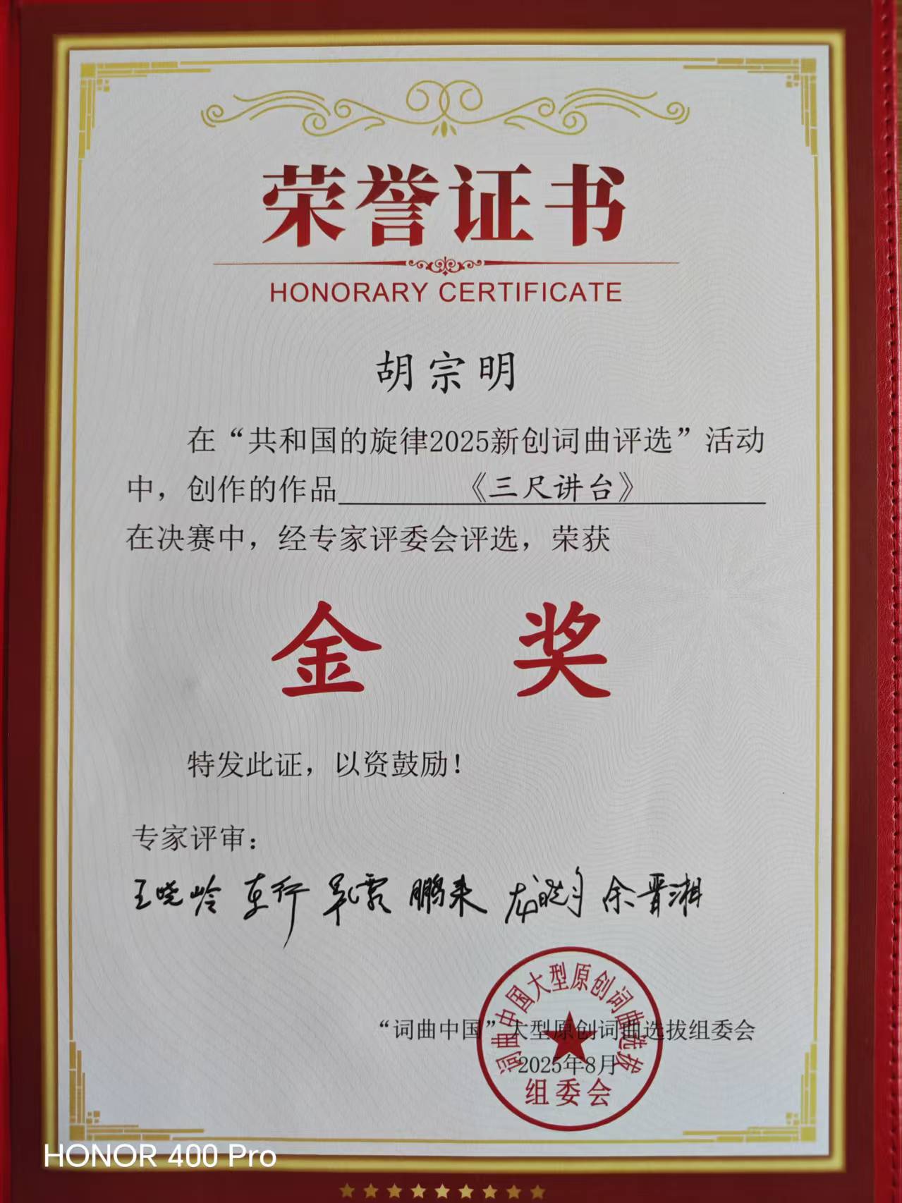 我市著名词作家胡宗明所创歌曲《三尺讲台》荣获“2025年共和国的旋律新创词曲金奖”